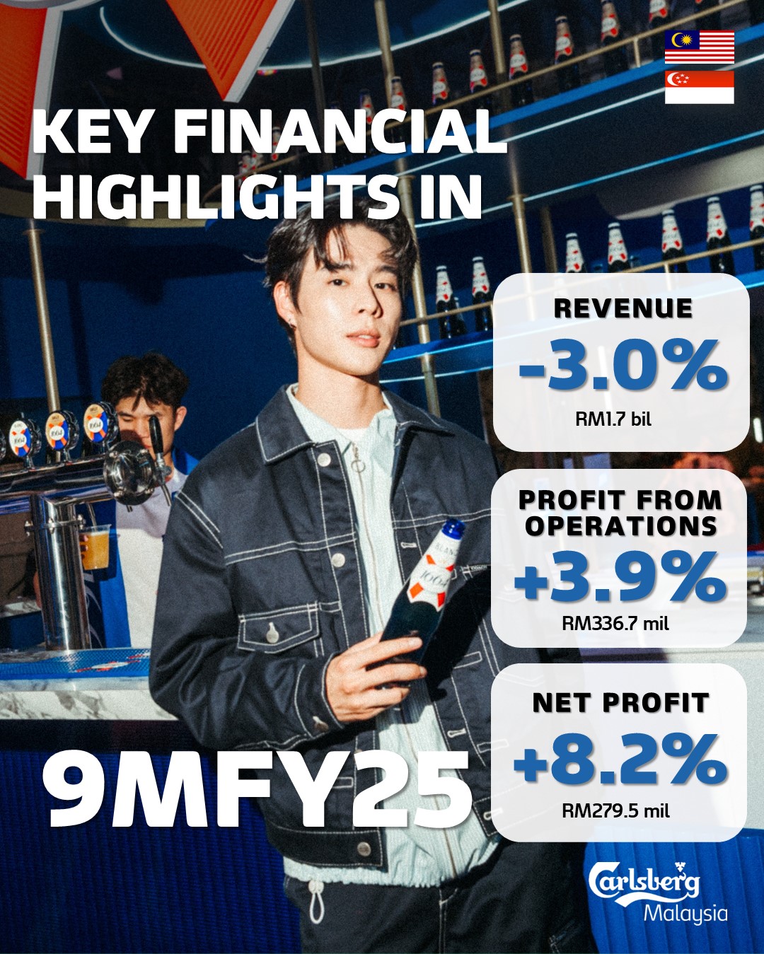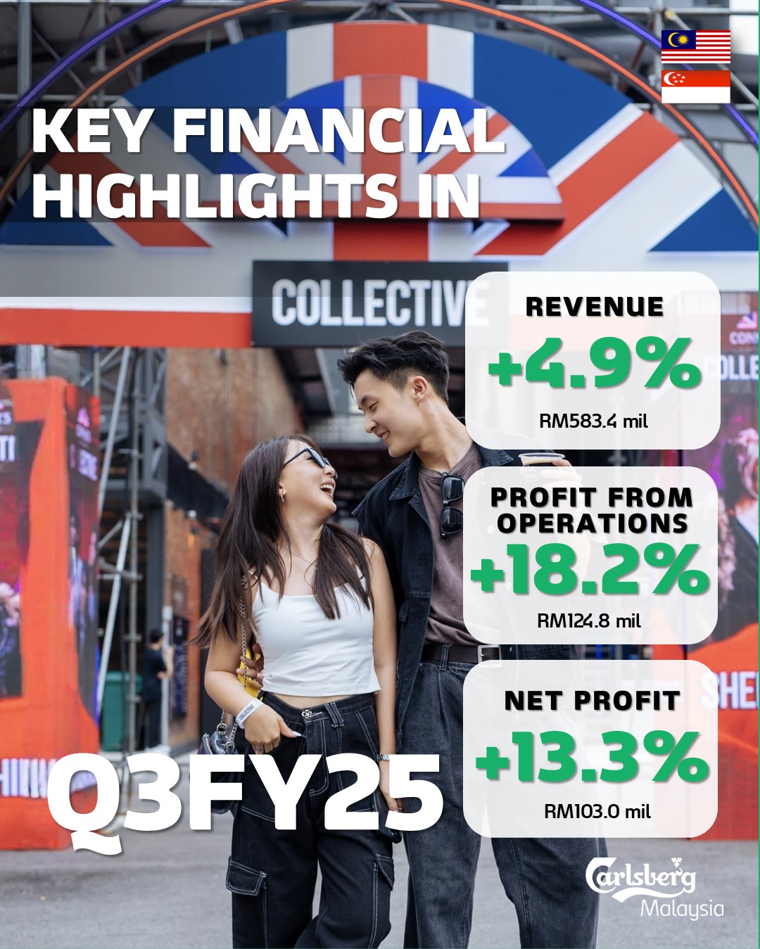 SHAH ALAM, 13 November 2025 – Carlsberg Brewery Malaysia Berhad (“the Group”) reported an increase in net profit of 13.3% to RM103.0 million for the third quarter ended 30 September 2025 (Q3FY25), on the back of a 4.9% increase in revenue to RM583.4 million compared to the same quarter last year.