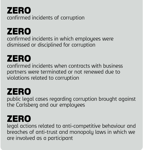 Building on this understanding, we will strive to safeguard our workforce and Carlsberg’s operations in their entirety by applying a strict zero-tolerance policy on bribery and corruption. We will reinforce clear expectations, strengthen internal oversight and ensure that every level of the organisation understands its responsibility to uphold these standards in our daily business conduct.