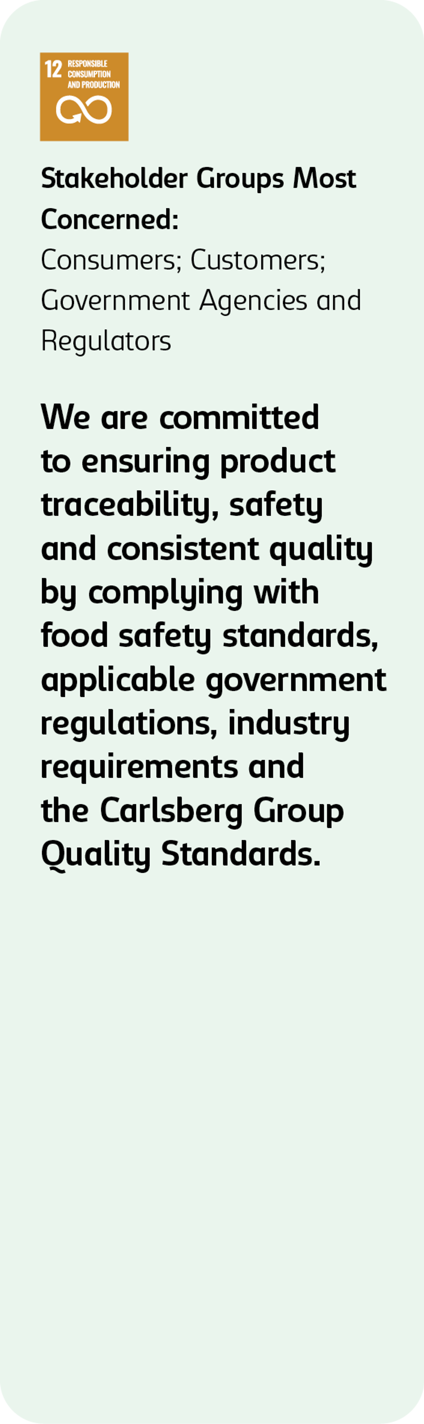 At Carlsberg, product quality and safety are governed by a defined set of regulatory, international and internal standards that apply across our operations, including: