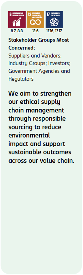 impact and occupational health and safety. We prioritise partnerships with reliable and ethical business partners to advance our employee safety, health and wellness, sustainable packaging and materials, as well as human rights and labour standards.