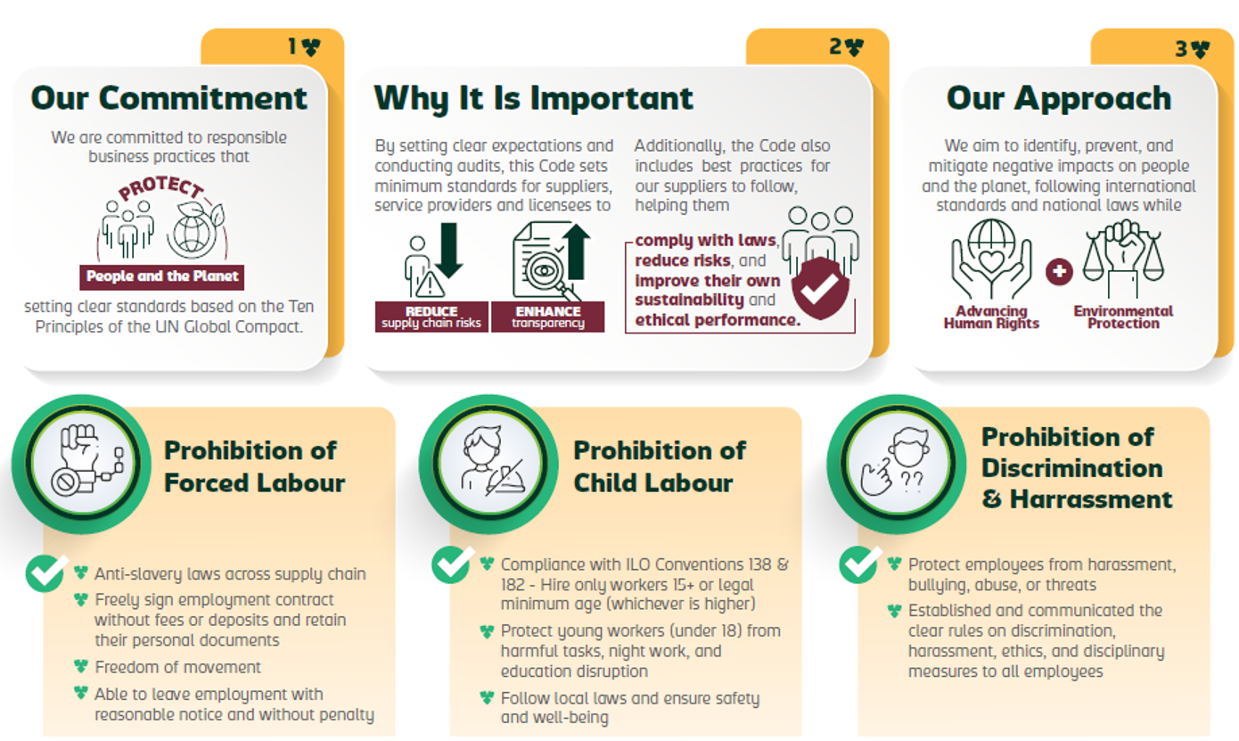 Our approach is also aligned with our Supplier and Licensee Code of Conduct and Procurement - Purchasing and Buying Policy, which were refreshed in 2025. The Code defines the requirements for all suppliers and licensees, encompassing labour and human rights, health and safety, environmental sustainability, business ethics, competition and fair trade and data protection.