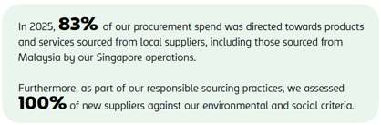 Sedex is a global membership organisation and platform, where we encourage our suppliers to subscribe to. This will help them in managing, storing, and sharing business data regarding ethical, social, and environmental practices in their supply chains. We also recognise the role of local suppliers in supporting community development and contributing to local economic growth.