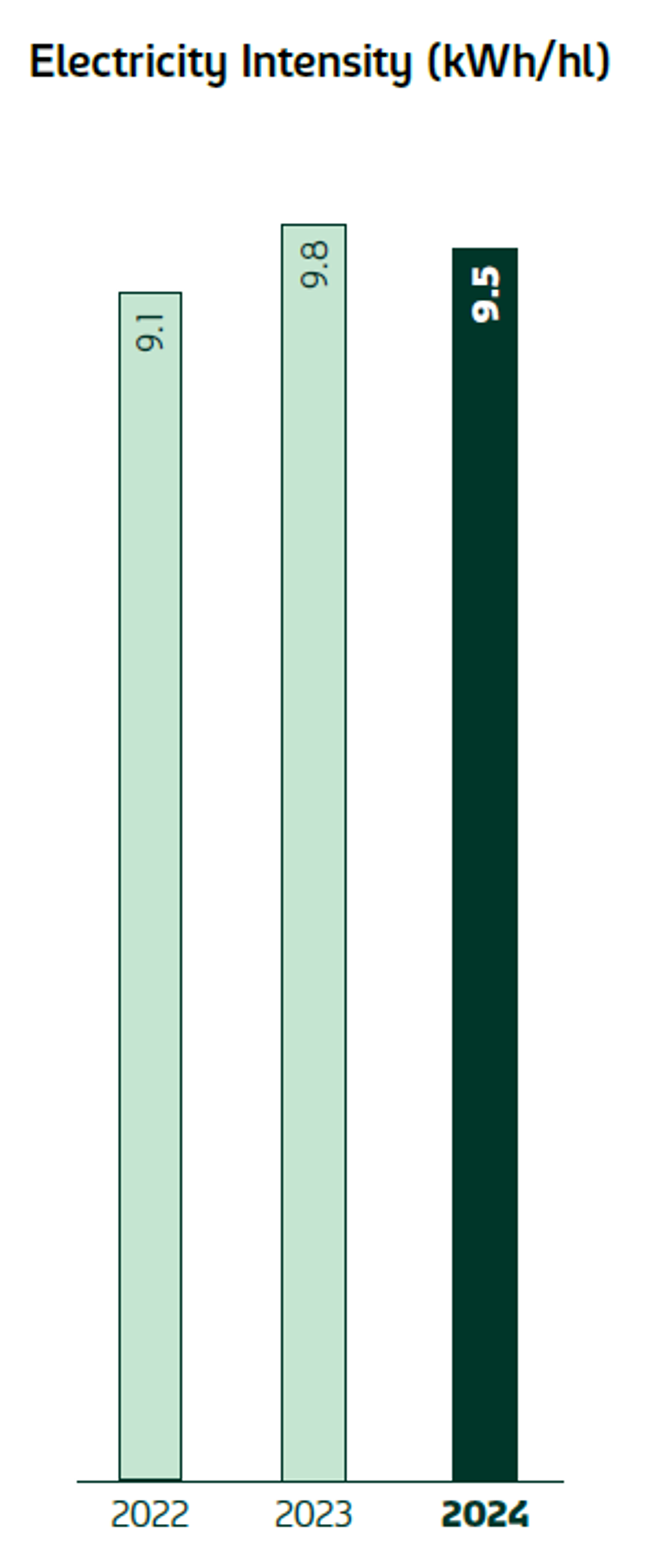 In 2024,our brewery’s electricity intensity decreased compared to 2023,driven by the optimisation of the cooling system during beer production.