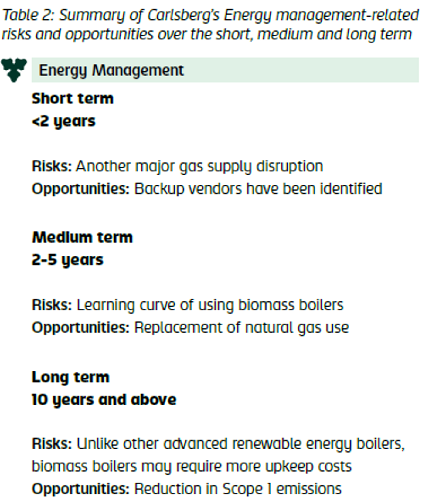 Based on the identified risks and opportunities over the short, medium and long term as identified in the previous section, we have put together the following risk management recommendations. For the alternative vendors for natural gas supplies, we have established a formal process for maintaining a panel of pre-qualified alternative fuel vendors. Triennial dry-run exercises simulating a supply disruption to test our brewery’s infrastructure, vendor response times and internal coordination will be conducted to develop the onsite experience and know-how to smoothly transition to the backup natural gas supply.