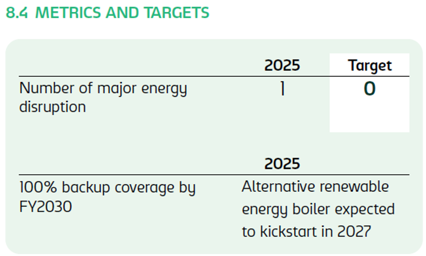For our natural gas consumption, a key risk consideration that has been added is the Shah Alam district-wide gas supply disruption due to a gas pipeline explosion in Putra Heights in April 2025. This affected our production, resulting in actual additional direct costs of RM0.52 million for alternative gas supplies and modifications to existing assets to prevent an extended operational halt.