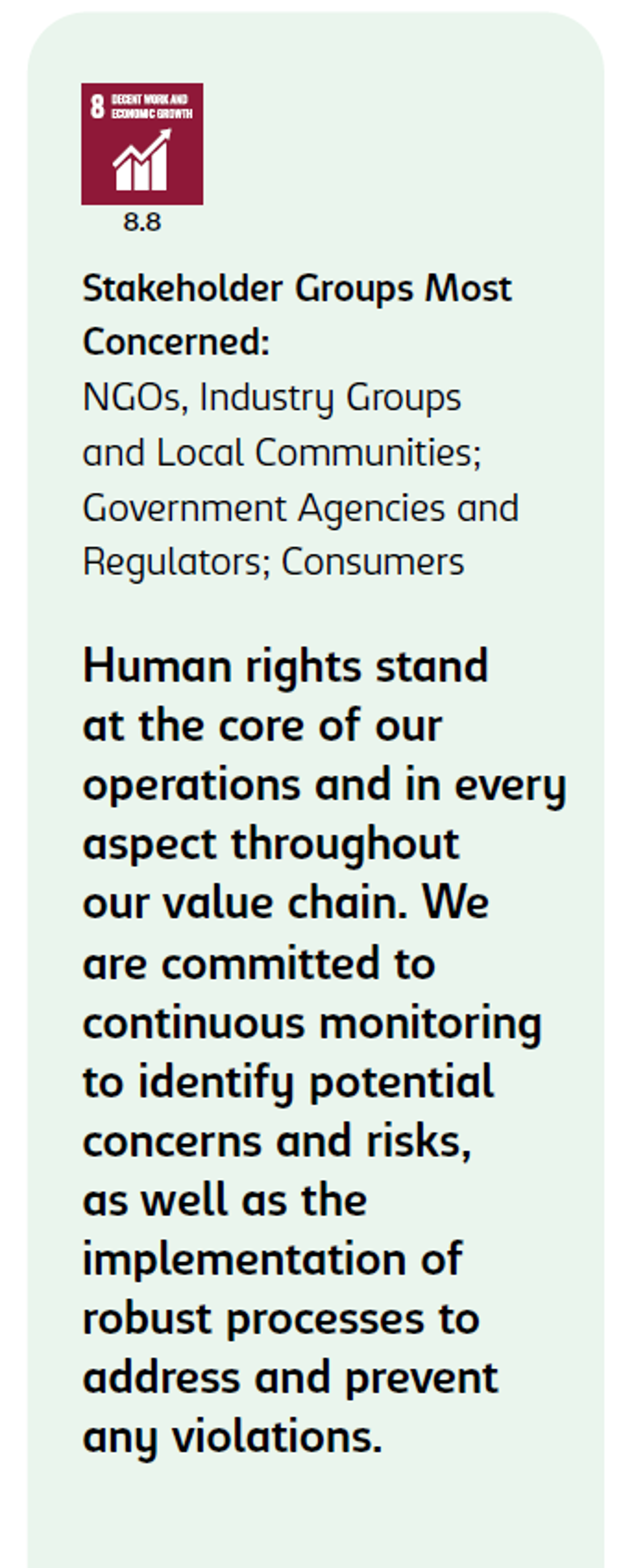 This commitment to respecting human rights is further strengthened by our Speak Up platform, which ensures confidentiality and anonymity when reporting violations without fear of retaliation.